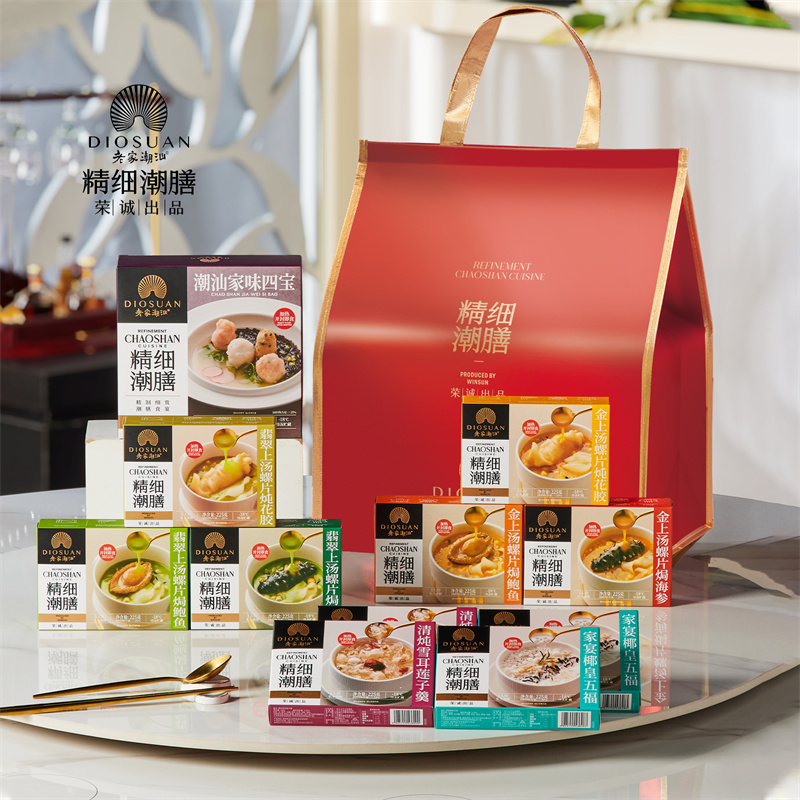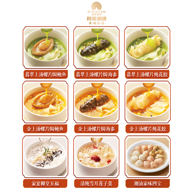 225g翡翠上汤螺片焗鲍鱼x1,225g翡翠上汤螺片焗海参x1, 225g翡翠上汤螺片炖花胶x1,225g金上汤螺片焗鲍鱼x1,225g金上汤螺片焗海参x1,225g金上汤螺片炖花胶x1,225g家宴椰皇五福x2,225g清炖雪耳莲子羹x2,1000g潮汕家味四宝x1