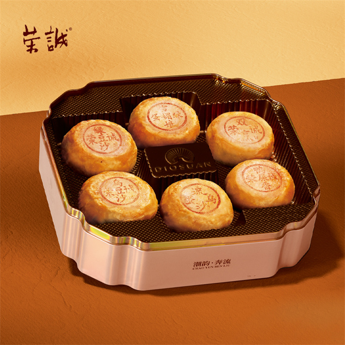 100g潮式绿豆沙月饼x1,100g潮式乌豆沙月饼x1,100g潮式双烹月饼x1,100g潮式鸭屎香茶月饼x1,80g潮式绿豆沙蛋黄雪媚娘月饼x1,80g潮式乌豆沙蛋黄流沙月饼x1