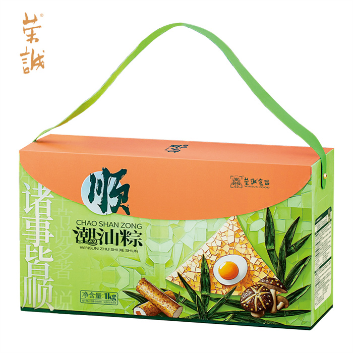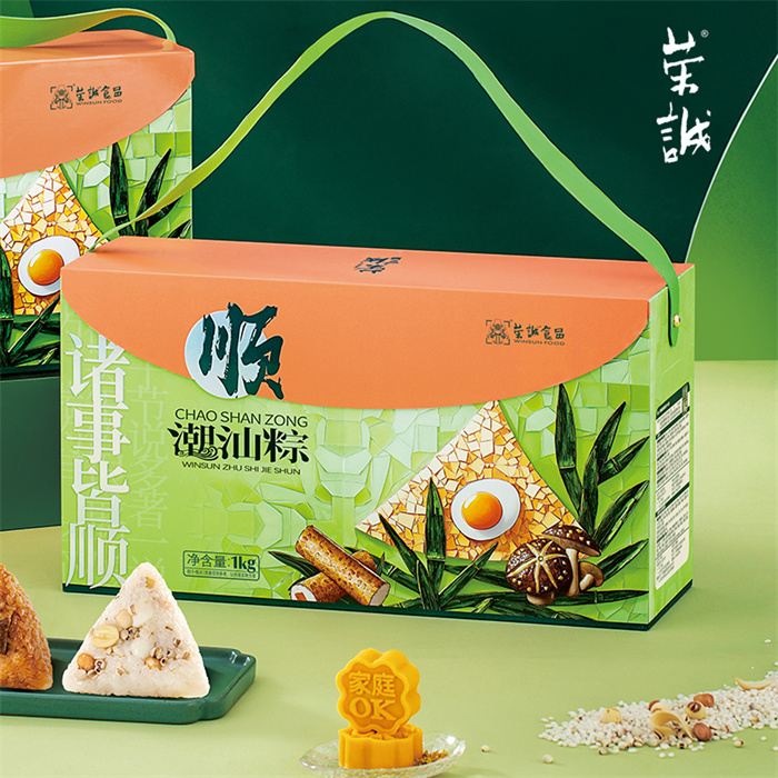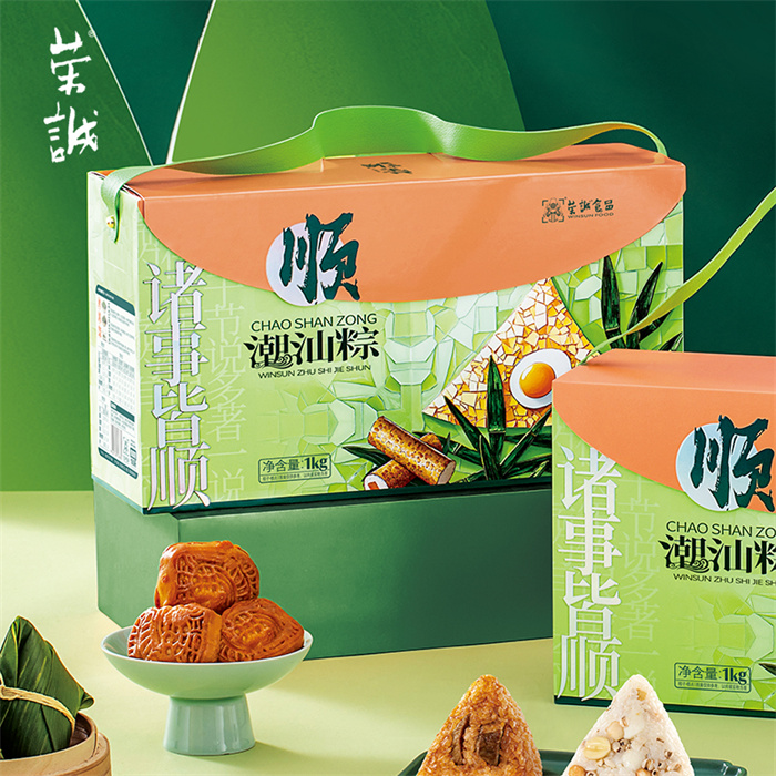 100g潮汕地道卤水肉粽x2,100g潮汕秘制菜脯鲜鸭肉粽x2,100g潮汕蜜制桂香糯藕粽x2,100g潮汕特色甜肴五果粽x2,35g腐乳饼x4,30g滋芯绿豆糕(海盐柠檬味)x2